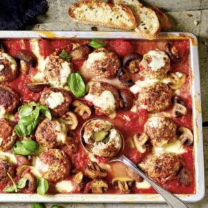 Mini-Mozzarellakugeln mit je 1-2 Basilikumblättchen ummanteln. Hackmasse in 16 Portionen teilen und Mozzarellakugeln darin einhüllen. Öl auf ein tiefes Blech geben und im heißen Ofen (E-Herd: 220 °C, Umluft: 200 °C, Gas: Stufe 4) erhitzen. Buletten darauf ca. 5 Minuten braten. Pilze zugeben, weitere ca. 5 Minuten braten, zwischendurch wenden.